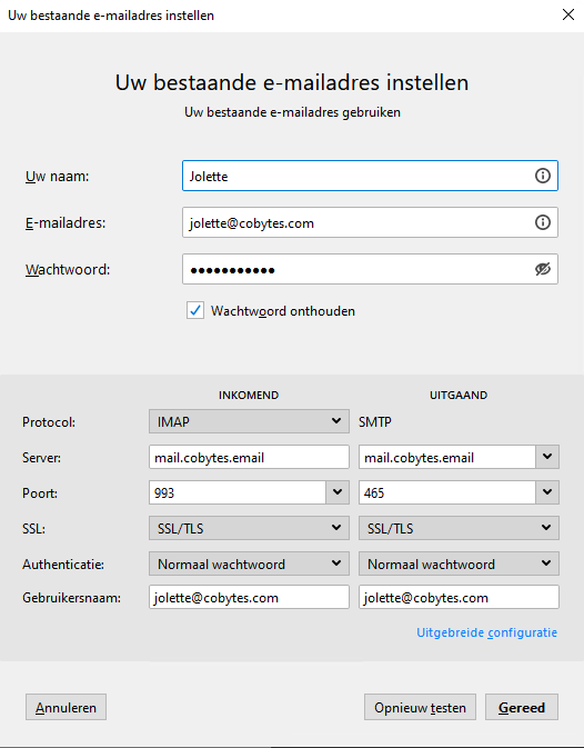 Vul je complete e-mailadres in en klik op 'Klaar'. Je komt nu terug bij de accountinstellingen. Nadat je dit venster sluit, kun je e-mail ontvangen en versturen via Thunderbird.